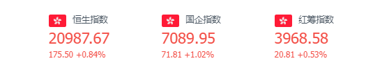 截至周四收盘,恒生指数涨0.84%,报20987.67点;国企指数涨1.02%,红筹指数涨0.53%。恒生科技指数涨1.83%,哔哩哔哩涨5.99%,京东涨5.25%,蔚来涨4.94%。香港航天科技暴跌超26%。