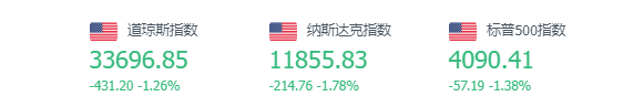 美股周四收跌,道指跌1.26%,报33696.85点;纳指跌1.78%,报11855.83点;标普500指数跌1.38%,报4090.41点。特斯拉收跌5.69%,英伟达收跌3.35%,AMD收跌5.99%,Shopify收跌15.88%,阿里巴巴收高0.03%。