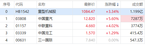 华盛资讯2月17日消息,港股重型机械股逆势走高,截至发稿,中国重汽涨5.60%,中联重科涨超4%,中国龙工涨超1%。