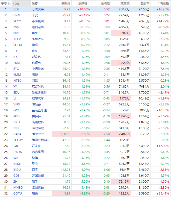 叮咚买菜今日反弹升10.19%昨日收跌16%,现报6.34美元每股,Q4净利扭亏为盈;ChatGPT概念股寺库集团微涨,禾赛涨1%。