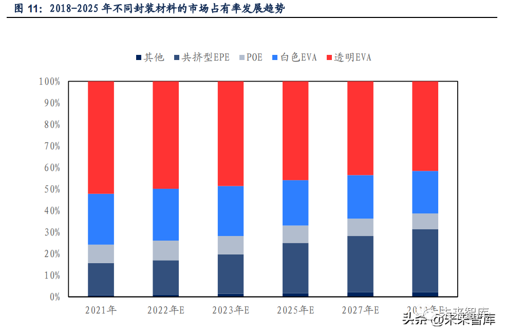 市场上封装材料主要有透明 EVA 胶膜、白色 EVA 胶膜、POE 胶膜、EPE(EVA-POE-EVA 共挤) 胶膜与其他封装胶膜(包括 PDMS/Silicon 胶膜、PVB 胶膜、TPU 胶膜)等。目前的主流是 EVA 胶膜,POE 胶膜在阻隔水汽能力、抗老化能力等方面表现突出。EPE 胶膜是 EVA 和 POE 共挤制备而成的,具备 POE 高抗老化能力、高阻隔水汽能力,同时 EVA 的加入也克服了纯 POE 胶膜加工性欠佳的问题,使得 EPE 胶膜兼具 POE 和 EVA 的优良性能。