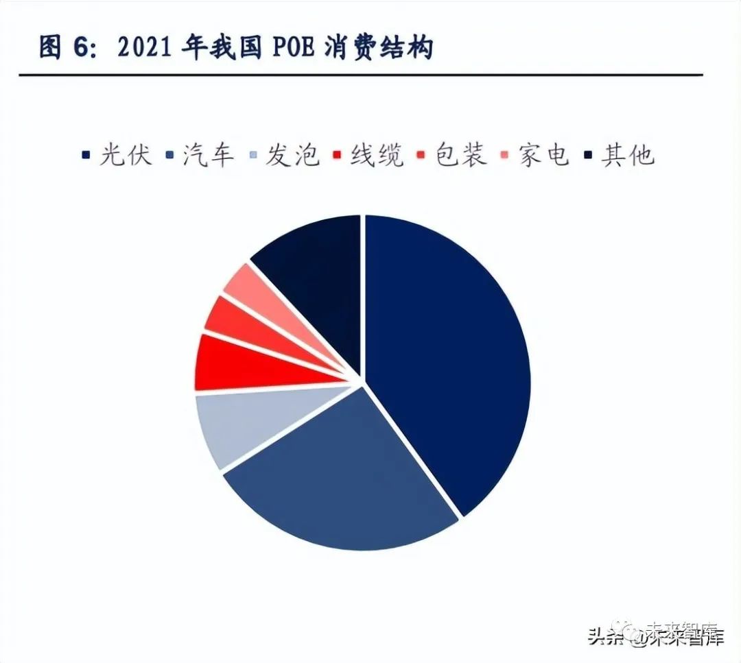 独特的形态结构赋予 POE 特殊的性能,从而使其拥有多种应用方式,有着广泛的用途。(1) POE 可直接用于改性,即直接与 PE、PP 等材料共混,起到增韧、抗冲击等效果。POE 直接 改性 PP 是其重要的市场应用,主要针对汽车零配件、家电外壳和口罩领域。POE 直接改性 PE 主要应用于防水卷材和管材领域。(2)POE 可接枝后再用于改性。一般是 POE 接枝极性 单体(MAH 或 GMA 等)后,再与 PA、PT 等聚酯类聚合物共混,改善其冲击性能,起到增韧 的效果。(3)POE 可在发泡领域,对 EVA 进行改性。EVA 底跑鞋在一定里程后会无法变回原 来状态,缓冲能力降低。POE 可替代 EVA 单独发泡作为运动鞋中底,综合考虑 EVA 的价格优 势,可将 POE 和 EVA 共混,产品质量更轻,压缩回弹更好,触感良好,泡孔均匀细腻,撕 裂强度高。(4)POE 可作为单一材料,应用于光伏胶膜领域。目前光伏组件用的封装胶膜 主要包括 EVA 胶膜和 POE 胶膜。