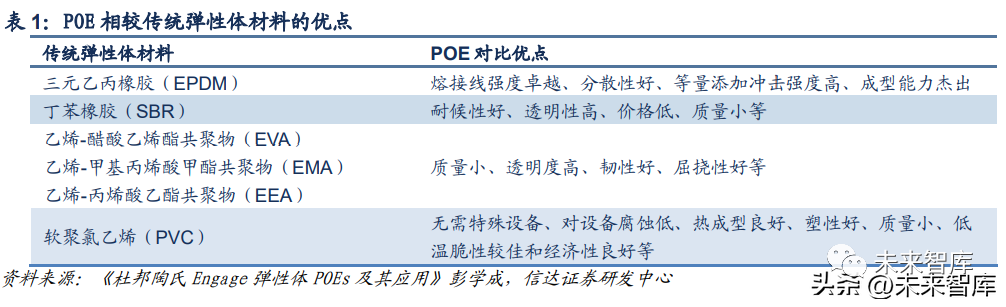 POE 与传统弹性体材料 EPDM、SBR 等相比有诸多优势,优异性能与其结构特点有关。POE 的 结构方面有以下特点:(1)α-烯烃(如辛烯)的柔软链卷曲结构和结晶的乙烯链作为物理 交联点,使其既具有优异的韧性又具有良好的加工性;(2)相对分子量分布窄,与聚烯烃 兼容性好,具有较佳的流动性;(3)没有不饱和双键,耐候性优于其它弹性体;(4)较强 的剪切敏感性和熔体强度,可实现高挤出,提高产量;(5)良好的流动性可改善填料分散 效果,可提高制品熔接痕强度。