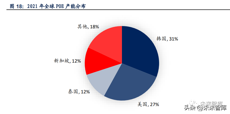 POE 的产能主要集中在除中国以外的亚洲地区,面向中国出口。2021 年,全球 POE 产能结 构中,韩国、泰国、新加坡三个亚洲国家占比分别达到 31%、12%和 12%,合计达到 55%,这 些产能很大程度上出口到中国。此外,美国也有 27%的产能。