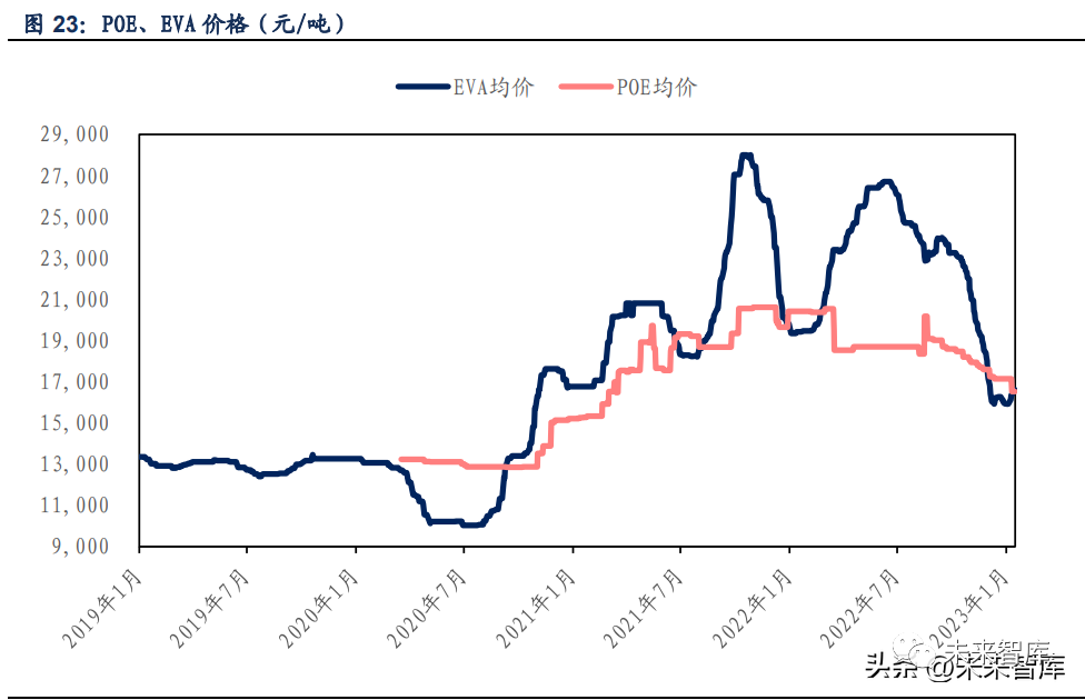 POE 与 EVA 的重要应用领域都是光伏胶膜领域,除了性能外,成本也将是制约其发展的重要 因素。一般情况下,POE 的生产壁垒更高,国内完全依赖进口,价格也比 EVA 更高。2021 年,光伏胶膜供需缺口引发 EVA、POE 价格上涨,EVA 价格短期超过 POE。2022 年 12 月,两 者价格又逐渐恢复到了 POE 高、EVA 低的状态。2022 年 12 月,EVA 均价 16260 元/吨,POE 均价 17206 元/吨。在如今企业纷纷布局 POE 的情况下,未来大批量国产化有可能降低 POE 价格,未来国内能够率先实现工业化生产 POE 的企业受益将有望是最大的。