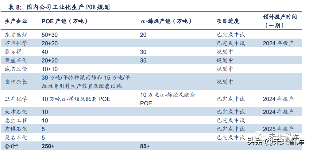 天津石化隶属于中国石化,成立于 1983 年 12 月 28 日。天津石化 POE 相关项目已开始建设。2022 年 03 月 22 日,中国石化天津南港乙烯项目土建 工程开工,标志着中国石化集团“十四五”期间,在南港工业区投资建设的天津南港高端 新材料产业项目集群迈入全新阶段。南港乙烯项目是中国石化南港高端新材料产业项目集 群的代表项目,以 120 万吨/年乙烯裂解装置为龙头,产业链延伸建设α-烯烃、超高分子 量聚乙烯等高端新材料装置,其中有 11 套装置采用中国石化自主知识产权的先进技术,建 设周期约 22 个月。作为中国石化天津南港高端新材料项目集群的领头雁,项目建成投产后, 将进一步助推传统石化产业向高端化、智能化、绿色化、一体化转型升级,为园区提供特 色化工材料和高端专用化学品,带动千亿级下游产业,助力南港工业区建设世界一流化工 新材料基地。
