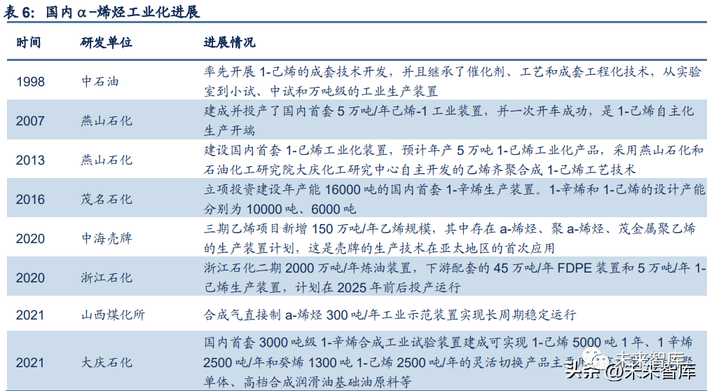 据《国内聚乙烯产品结构变化对α-烯烃发展的影响》,国内 1-丁烯供应能力较强,1-己烯 产能不足,1-辛烯技术未实现突破。在 1-丁烯方面,2020 年国内的产能约为 81 万吨/年,2025 年预计产能为 120 万吨/年。主 要的生产方法是乙烯装置及炼厂催化裂解装置副产 C4 馏分和乙烯二聚工艺。在异丁烯合成 MTBE 技术研发成功后,1-丁烯的主要生产方法为 C4 分离法,乙烯二聚工艺由于高成本的 缘故近年在市场中逐渐被淘汰。在 1-己烯方面,主要生产方法有石蜡裂解、乙烯齐聚、乙烯三聚和费托合成法。乙烯齐聚 法的产物复杂,分离困难,被国外的 BP Amoco、INEOS 等公司所垄断。国内 1-己烯的主要 生产方法是乙烯三聚法,该方法在纯度、产率方面较高,由中国石化在 2007 年实现工业化, 但产能仍然较小。在 1-辛烯方面,主要生产方法是乙烯齐聚、乙烯四聚和费托合成法。国内在 1-辛烯的生产 方面技术长期未实现突破,乙烯四聚法是生产 1-辛烯产品较先进的方法,产品含量大约在66%以上,截至 2021 年全球仅 Sasol 公司实现了工业化生产,我国仍处于技术摸索状态。在工业上,由于国外企业对线性α-烯烃技术封锁以及高价技术转让费,我国每年需要从国 外进口大量高碳α-烯烃。制备高碳α-烯烃所用乙烯齐聚技术难点在于催化剂价格昂贵, 催化活性和选择性缺陷,以及副产物易堵塞管道等一系列问题,国内厂商大多处在小试阶 段。