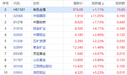 华盛资讯2月20日消息,有色金属概念股集体走高,截至发稿,中铝国际涨超11%,中国宏桥涨近8%,招金矿业涨超4%,中国铝业涨近3%,紫金矿业涨超1%,山东黄金、江西铜业股份跟涨。