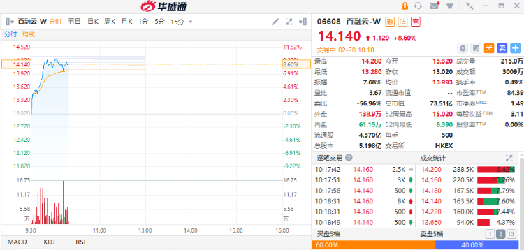 华盛资讯2月20日消息,百融云-W早盘走高,截至发稿,现涨近9%,报14.14港元,成交额3009万港元。