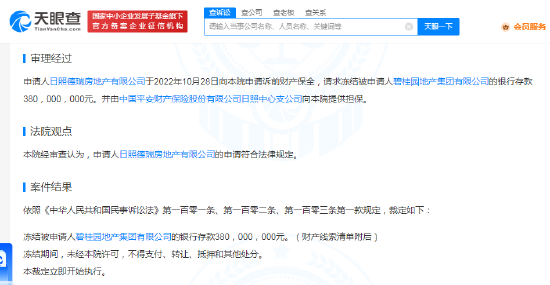 天眼查App显示,近日,日照德瑞房地产有限公司、碧桂园地产集团有限公司非诉财产保全审查裁定书公开。文书显示,申请人日照德瑞房地产有限公司于2022年10月向法院申请诉前财产保全,请求冻结被申请人碧桂园地产集团有限公司的银行存款3.8亿元。法院审查认为该申请符合法律规定,裁定执行。