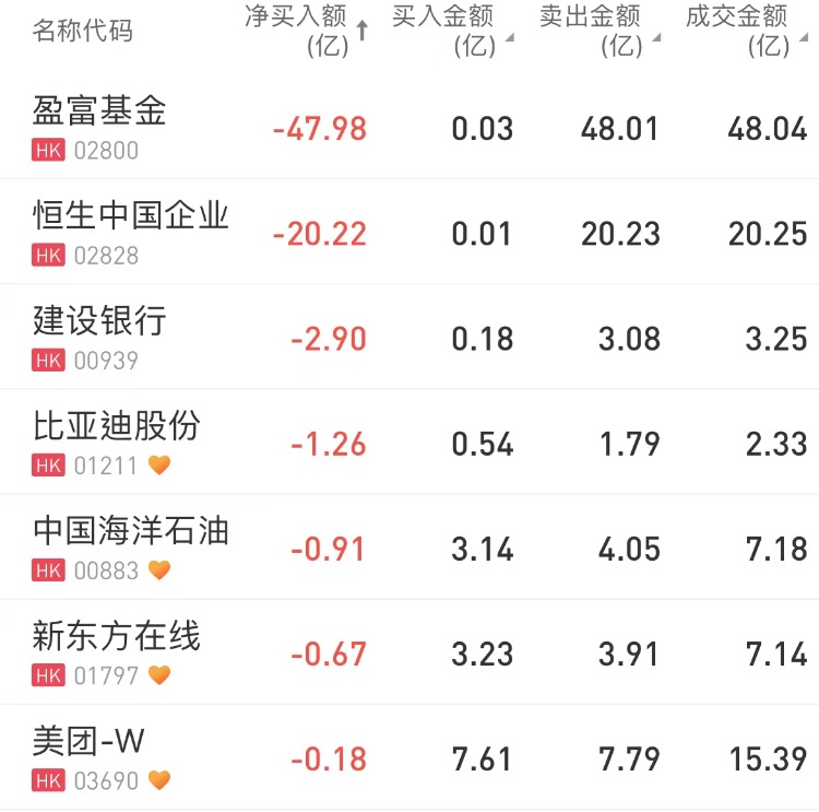 中国移动获净买入8.53亿港元;盈富基金、恒生中国企业、建设银行分别遭净卖出47.98亿港元、20.22亿港元、2.9亿港元。