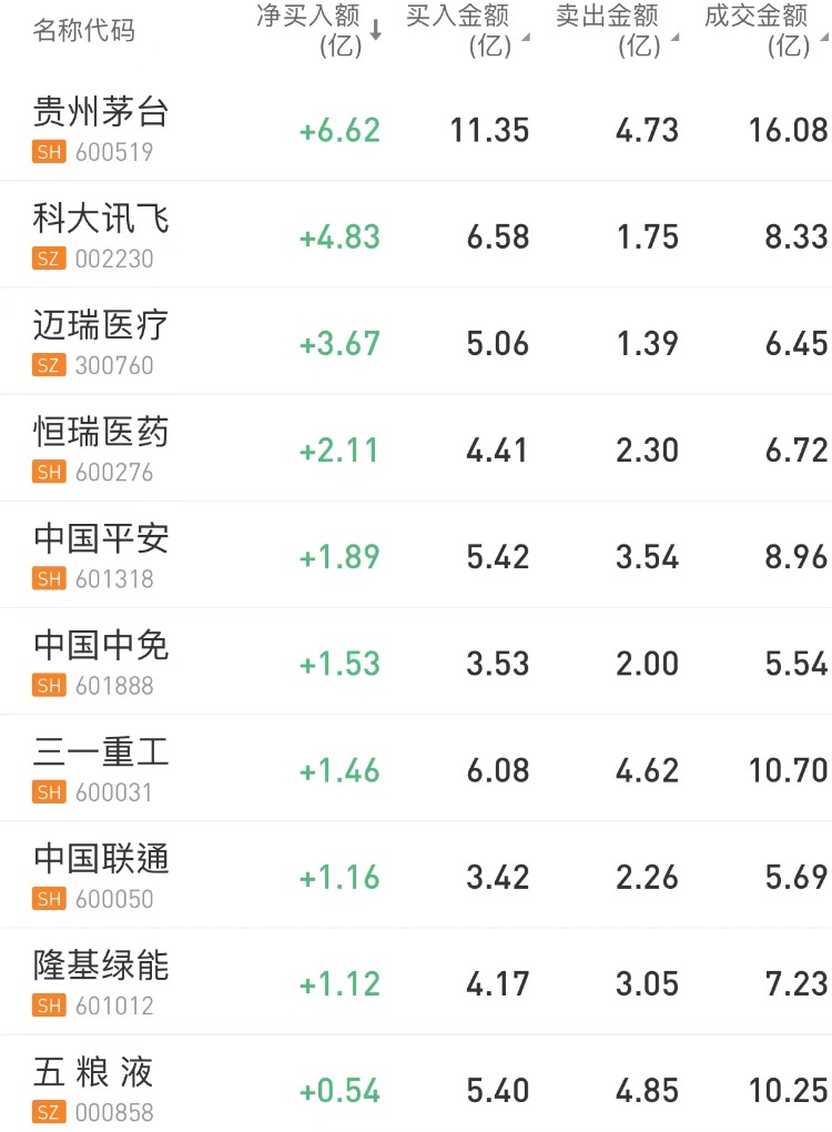 北向资金今日大幅净买入A股60亿元。贵州茅台、科大讯飞、迈瑞医疗分别获净买入6.62亿元、4.83亿元、3.67亿元。陕西煤业净卖出额居首,金额为3.23亿元。
