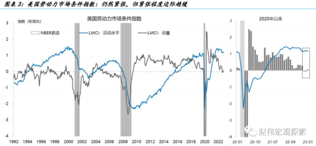 但是,最紧张的阶段已经过去。考虑到供给、需求、周转或景气类指标指示的信息并不总是一致的,美联储构建了劳动力市场条件指数(LMCI),底层包含了24个指标。LMCI水平值显示,美国劳动力市场处于非常紧张的状态,高于历史均值1.2个标注差,紧张程度高于疫情前夕,可比2000年“互联网泡沫”破裂前夕。但最紧张的阶段已经过去,时间为2022年2月——供求缺口的最大值出现在2022年3月(590万)。LMCI动量指标在2022年11-12月连续两个月为负,表明美国劳动力市场已经“再平衡”过程。这主要是由劳动需求下降驱动的。2023年1月LMCI动量指标再次转正,表明再平衡过程并非一帆风顺。