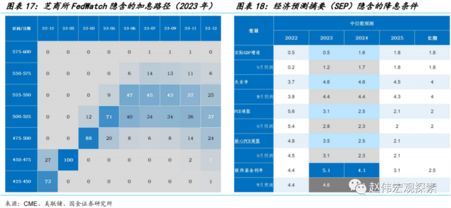 何时降息目前还不是FOMC的优先事项。FOMC也没有明确降息的门槛。降息的条件隐藏季度例会的经济预测摘要(SEP)中。SEP对基本面和联邦基金利率的预测是相互依赖的关系。2022年12月SEP认为,降息的时点位于2024年。比较2023和2024年的基本面预测可知,降息的四个门槛值(threshold)分别为:实际GDP增速0.5%,失业率4.6%、整体PCE通胀3.1%和核心PCE通胀率3.5%。基本面弱于预期或通胀低于预期是降息前置的条件。值得强调的是,12月SEP认为,2024年降息100bp,对应的PCE和核心PCE通胀都是2.5%。这意味着,即使开始降息,节奏也是比较缓慢的。