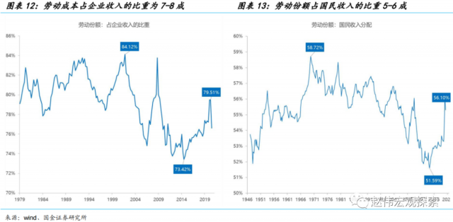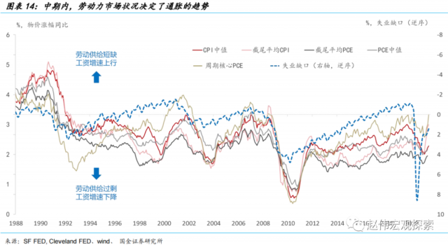 中期内,劳动力市场状况决定了通胀的中枢。假定一个简化的两部门模型(企业和家庭),物价将由工资、加成率(mark-up)和劳动生产率三个变量决定。短期内,假定加成率和劳动生产率保持不变,工资将决定物价。工资增速与劳动生产率增速的差异就是所谓的“工资通胀”。假如工资增速为5%,劳动生产率增速为1%,那么工资通胀就是4%。考虑到竞争因素,如果企业愿意例如吸收1%的涨价,那么最终的通胀率就是3%。