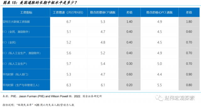 根据历史上工资与通胀之间相对稳定的关系,可计算不同工资增速隐含的通胀率。在2022年6月为美国工资增长的高峰期,各工资指标隐含的CPI和核心PCE通胀率如下表所示。过去半年,虽然工资增速已经放缓,但较难回到疫情前的低位。假设就业成本指数(ECI)的涨幅稳定在4%(2019年底为2.6%),隐含的整体CPI通胀约为3.6%,隐含的核心PCE通胀约为3.3%,远高于美联储2%通胀目标。