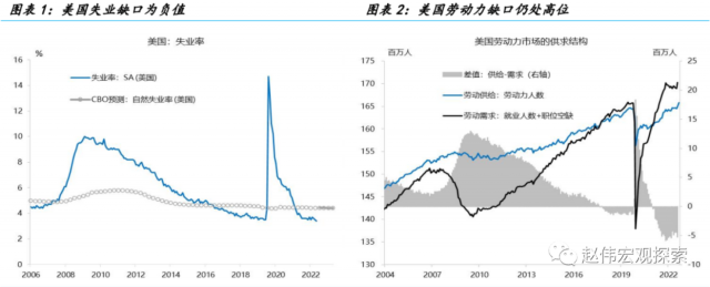 美联储对美国劳动力市场的描述是“非常紧张”(very tight)。如何度量紧张程度?理论上,一般用“失业缺口”(实际失业率-自然失业率)度量劳动力市场紧张程度:缺口大于零表示松弛(slack),小于零时表示紧张,绝对值大小表示程度。美联储和美国国会预算办公室(CBO)都认为当前美国的自然失业率为4.0%。2023年1月失业缺口为3.4%,失业缺口为-0.6%,紧张程度略高于2020年2月(失业缺口为-0.5%)。