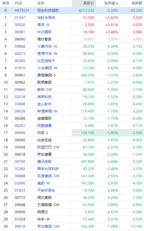 科网股走低,京东集团跌幅超7%、快手-W跌超5%;百度集团、腾讯控股、美团-W、阿里跌超2%,哔哩哔哩、网易跌超1%。