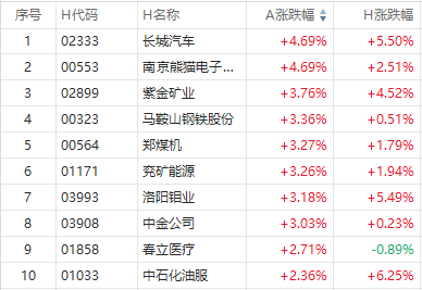 截至发稿,长城汽车A股涨4.69%,H股现涨5.50%,南京熊猫电子股份A股涨4.69%,H股现涨2.51%,紫金矿业A股涨3.76%,H股现涨4.52%。