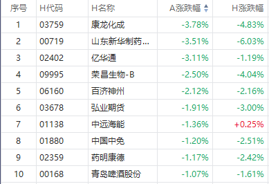 截至A股收盘,AH股跌幅前10如下: