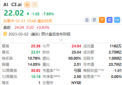 周二,C3.ai(AI.US)盘中下挫跌超7%,截至发稿,该股报22.02美元。C3.ai此前宣布扩大与亚马逊云服务(AWS)的战略合作协议,以提供增强的AI解决方案。