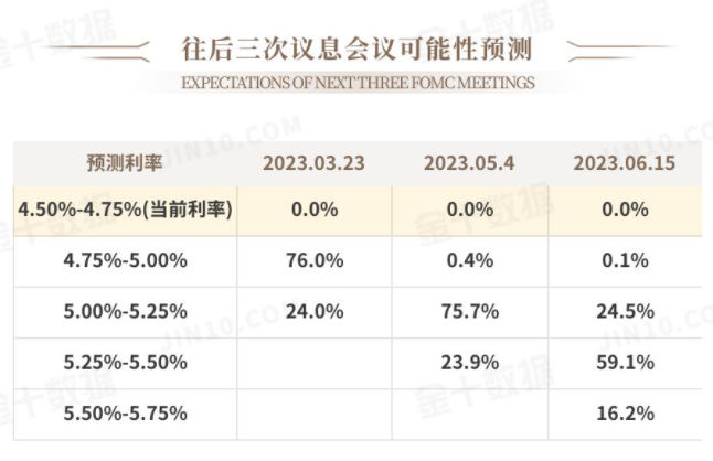据CME“美联储观察”:美联储3月加息25个基点至4.75%-5.00%区间的概率为76.0%,加息50个基点至5.00%-5.25%区间的概率为24.0%;到5月累计加息25个基点的概率为0.4%,累计加息50个基点的概率为75.7%,累计加息75个基点至5.25%-5.50%区间的概率为23.9%。