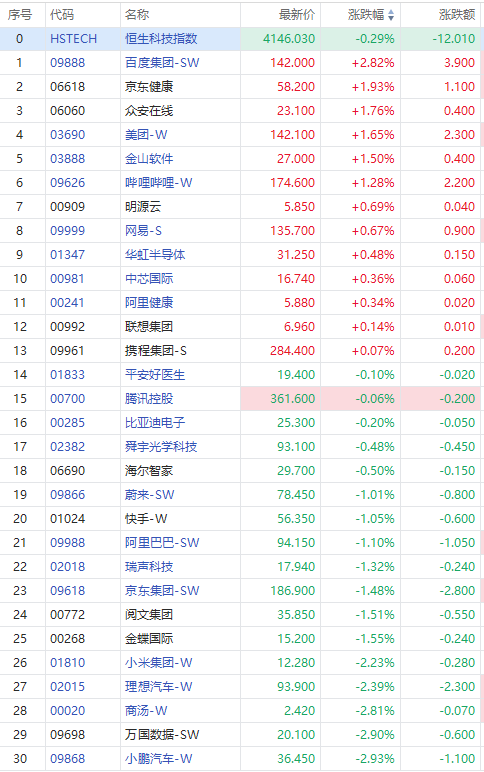 其他成分股方面,商汤跌近3%;京东健康、众安在线涨近2%。