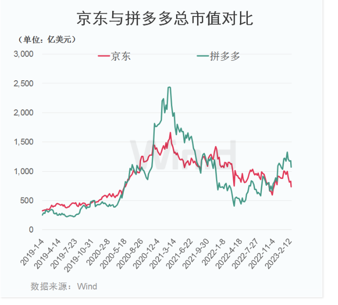 事实上,从两家公司市值对比来看,2020年6月份之间,京东总市值多数时间高于拼多多,而在2021年初的时候,拼多多总市值快速飙升,一度超过京东约700亿美元,随后两者市值差距缩小,随着去年11月以来的一波反弹行情,拼多多再度反超京东,市值差距拉大至300亿美元。后来者的穷追不舍,让京东时刻保持着较大危机感。