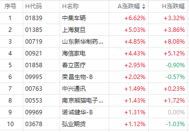 截至发稿,中集车辆A股涨6.62%,H股现涨3.32%,上海复旦A股涨5.03%,H股现涨3.86%,山东新华制药股份A股涨4.85%,H股现涨8.08%。