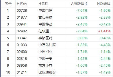 中国电信A股跌7.64%,H股现跌1.95%,君实生物A股跌2.92%,H股现跌2.38%,亿华通A股跌2.04%,H股现涨1.41%。