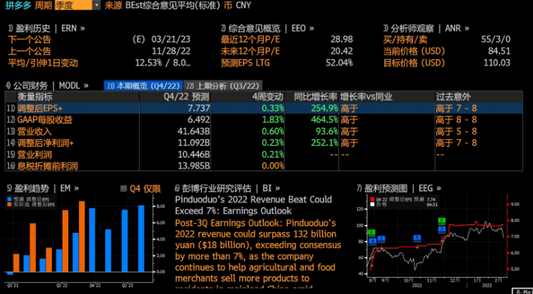 从彭博的一致性预期来看,四季度拼多多营业收入将达到416.43亿元(单位下同),同比增长93.6%;调整后净利润为110.92亿元,调整后的每股收益为6.492元,同比增长464.5%。多数分析师对拼多多第四季的业绩表现预期向好,收入、净利润及调整后EPS+增长率均高于同业,业绩优势有望保持。