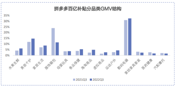 国海证券研报中指,从拼多多的业绩结构来看,百亿补贴作为拼多多品牌化的第一抓手,从用户侧和商家侧同时推动平台GMV。2022Q3数码电器、美容个护等高客单价商品GMV占比均同比提升,主站品类结构持续优化。