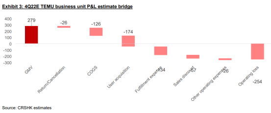 华兴证券则表示,四季度Temu有望实现健康的GMV增长达2.8亿美元,但其在用户获取、销售上的支出成本较大,料Q4运营亏损2.5亿美元。但看好其长期增长前景,料其是拼多多未来股价催化剂,潜在年度GMV375亿美元。对于拼多多的第四季GMV的表现,该行表示,预期该季度公司GMV将实现30%的增长,增速扩大84bps(+yoy),料拼多多Q4收入增长64%。