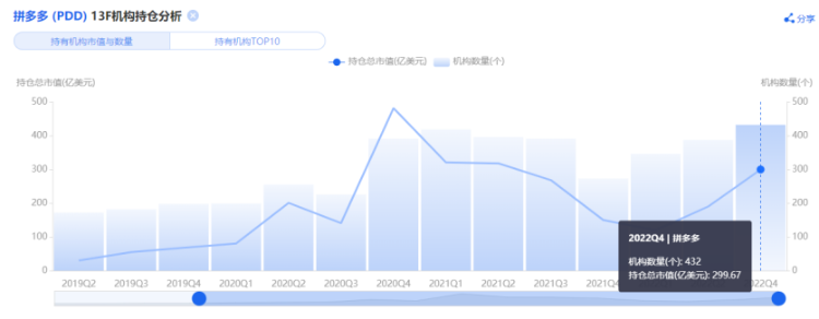 值得注意的是,华尔街机构四季度对拼多多态势分化,根据13F文件,景林连续两季度加仓拼多多,列美股第一大重仓股,高瓴同步增持;桥水、汇丰等则大幅减持。目前来看,机构对拼多多的持股总市值已增至299.67亿美元,占比个股总市值近30%,持股机构数同样有所上升。