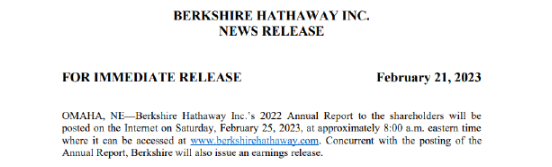 股神巴菲特旗下伯克希尔·哈撒韦公司当地时间周二发布公告称,公司将于美东时间周六上午8点(北京时间晚9点)左右发布2022年年报,同时发布的还有巴菲特致股东信。另外,伯克希尔公司计划5月6日召开年度股东会。