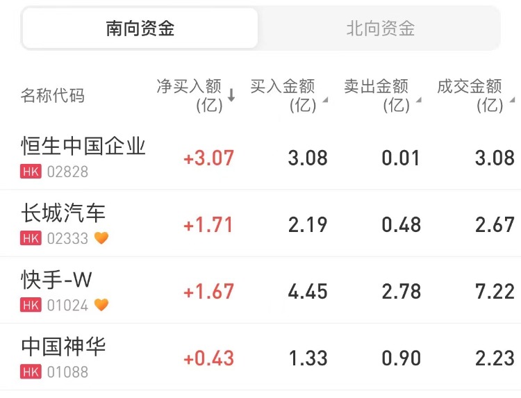 南下资金净买入恒生中国企业3.07亿港元,净买入长城汽车1.71亿港元,快手-W、中国神华、新东方在线分别获净买入1.67亿、0.43亿、0.19亿港元。