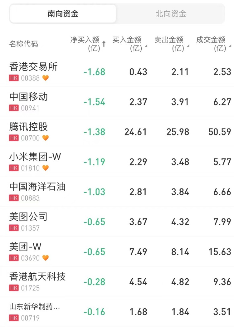 香港交易所遭南下资金抛售1.68亿港元,此外,中国移动、腾讯控股、小米集团分别获净买入1.54亿、1.38亿、1.19亿港元。