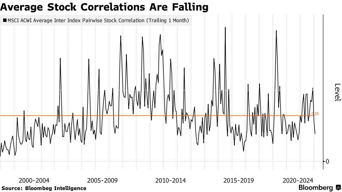 彭博策略师亚当斯(Gina Martin Adams)和沃尔夫(Gillian Wolf)曾在2月2日的一份报告中提到,摩根士丹利资本国际全球指数1月份的平均相关性读数触及2021年10月以来的最低水平,而一个月回报的方差则飙升至高于平均水平,脱离了疫情创下的低点。