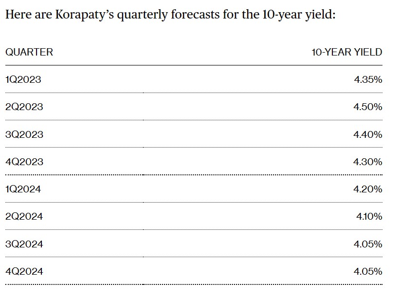 高盛的首席利率策略师Praveen Korapaty去年12月预计,10年期美债收益率在2023年第二季度将跃升至4.5%,随后在第三季度跌至4.4%,预计2023年最终以4.3%收尾。Korapaty预计2024年将呈现出回落趋势。