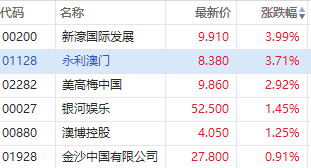 华盛资讯2月23日消息,濠赌股早盘集体上涨,截至发稿,新濠国际发展、永利澳门涨近4%,美高梅中国涨近3%,澳博控股、银河娱乐涨超1%。