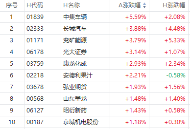 截至发稿,中集车辆A股涨5.59%,H股现涨2.08%,长城汽车A股涨3.88%,H股现涨4.48%,兖矿能源A股涨3.79%,H股现涨5.33%。