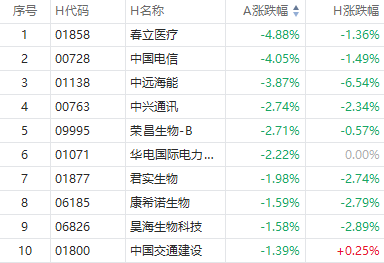 春立医疗A股跌4.88%,H股现跌1.36%,中国电信A股跌4.05%,H股现跌1.49%,中远海能A股跌3.87%,H股现跌6.54%。