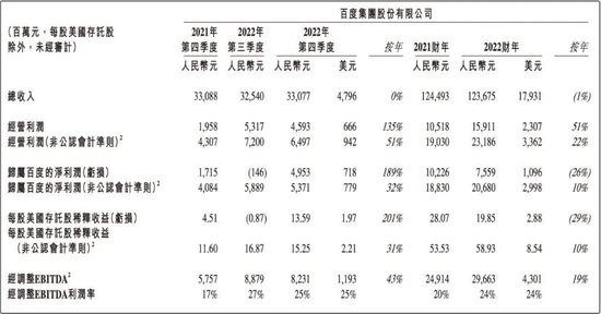 2月22日发布的百度最新财报显示,去年全年,百度实现营收1236.75亿元,归属百度的净利润(非美国通用会计准则)206.8亿元,同比增长10%。