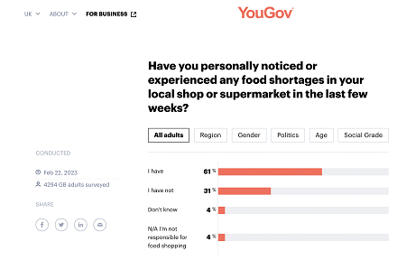 在民调机构YouGov进行的一项最新调查中,61%英国受访者表示,过去几周他们亲身注意到或经历过当地商店或超市的食品短缺。