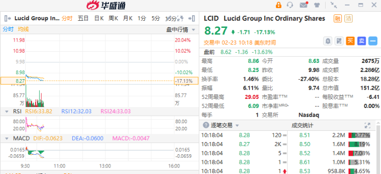 周四,Lucid $LCID 在公布财报后股价走低,截至发稿,该股跌超17%,报8.27美元。
