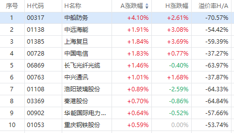 截至发稿,中船防务A股涨4.1%,H股现涨2.61%,中远海能A股涨1.91%,H股现涨3.08%,上海复旦A股涨1.84%,H股现涨3.69%。