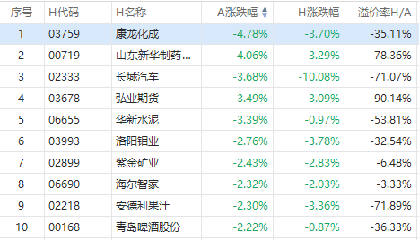 康龙化成A股跌4.78%,H股现跌3.7%,山东新华制药A股跌4.06%,H股现跌3.29%,长城汽车A股跌3.68%,H股现跌10.08%。