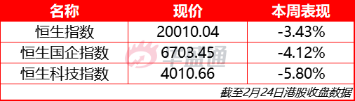 恒生指数本周跌3.43%,报20010.04点;国企指数本周跌4.12%,报6703.45点;恒生科技指数本周跌5.8%,报4010.66点;