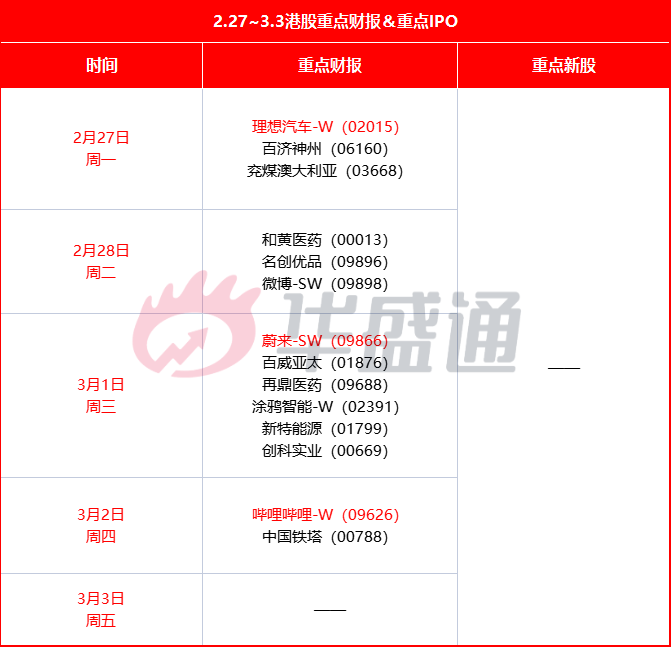 下周港股重磅财报方面,重点关注周一(2.27)的理想汽车和周三(3.1)的蔚来汽车以及周四(3.2)的哔哩哔哩;下周暂无新股上市。