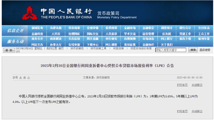 2月20日,中国人民银行授权全国银行间同业拆借中心公布,2023年2月20日贷款市场报价利率(LPR)为:1年期LPR为3.65%,5年期以上LPR为4.3%。